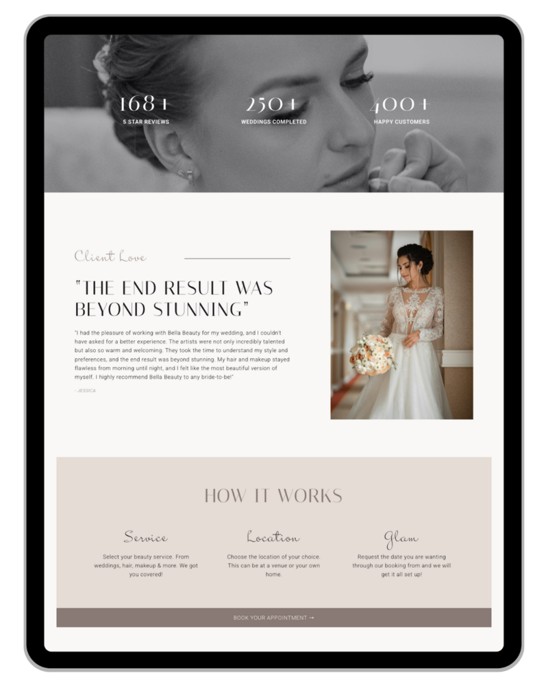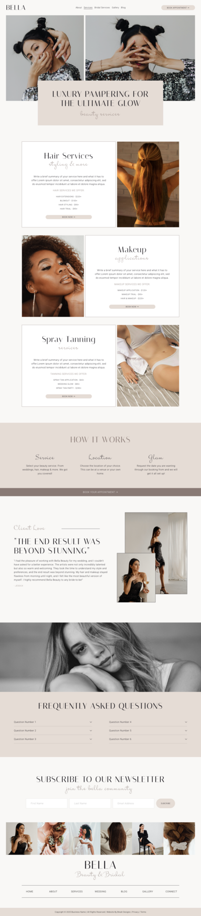 Elevate your business with this stunning luxury Squarespace Website Template. Designed for high-end salons, spas, beauty professionals, or any other business industry. This elegant and fully responsive template features a sleek design, and seamless navigation. Perfect for showcasing your services, portfolio, and client testimonials with style.