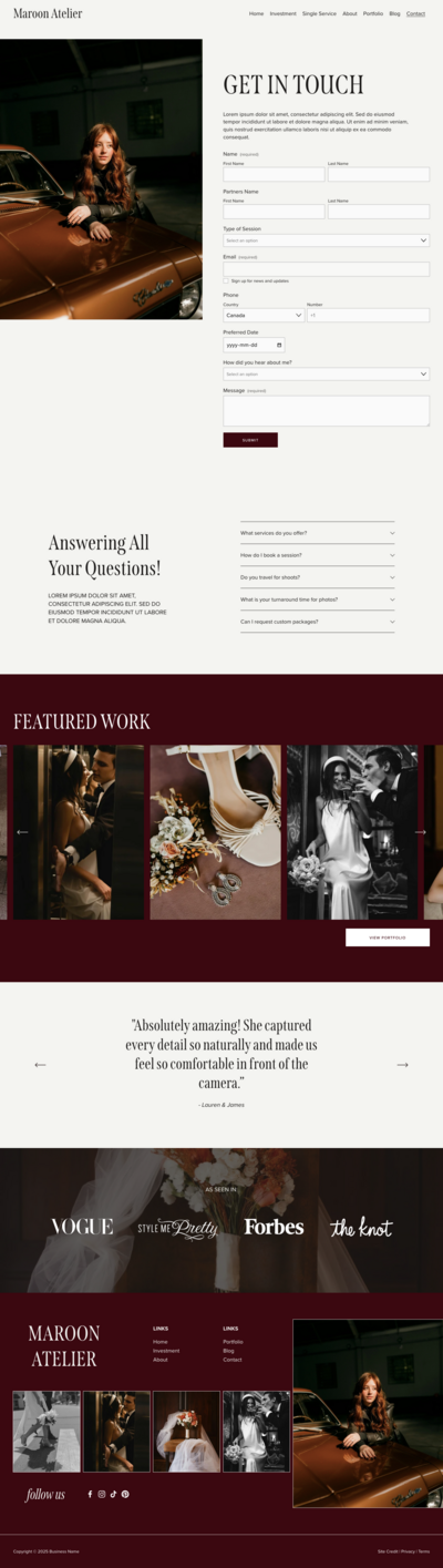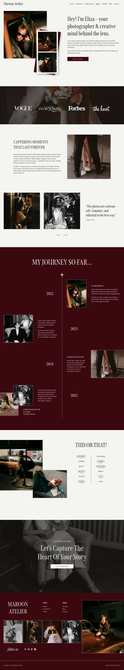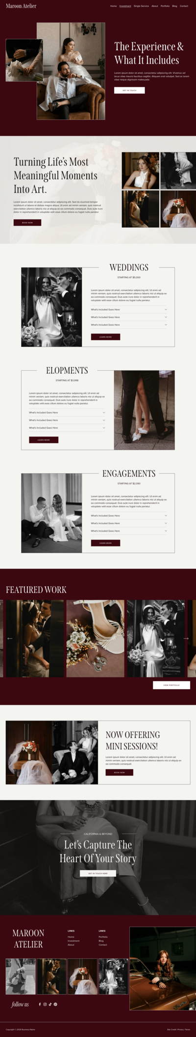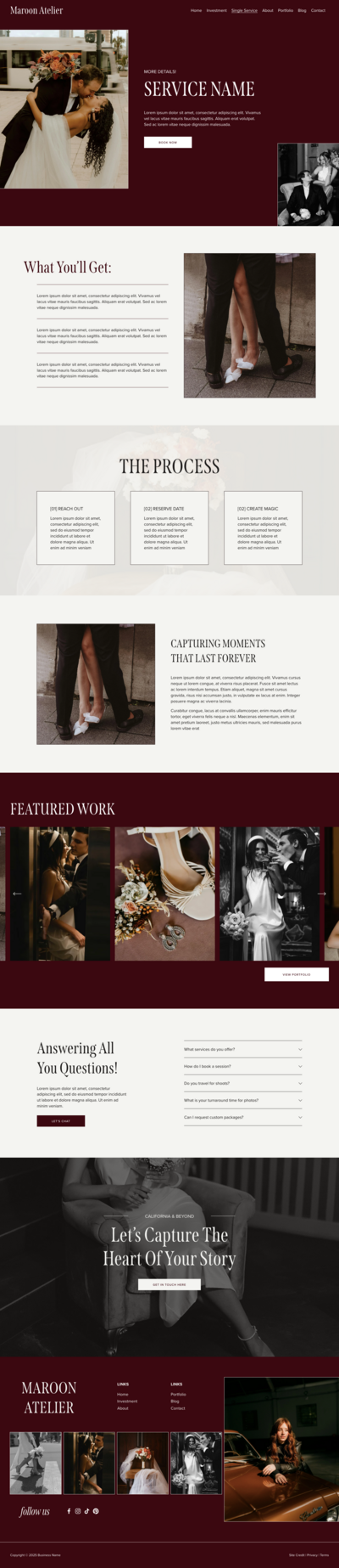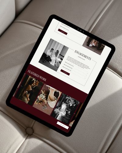 Elevate your brand with this luxury Squarespace website template, perfect for photographers, creatives, and event professionals. Featuring a dark, moody maroon aesthetic and modern editorial design, it’s fully customizable to showcase your portfolio, attract clients, and create a sophisticated, timeless online presence.