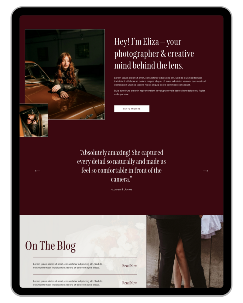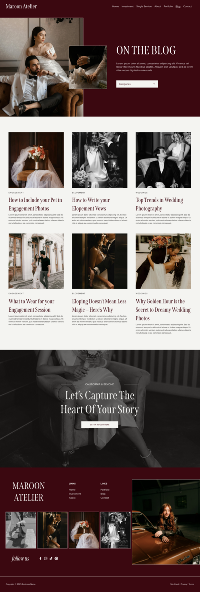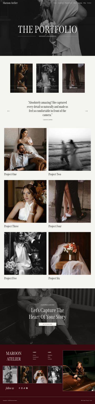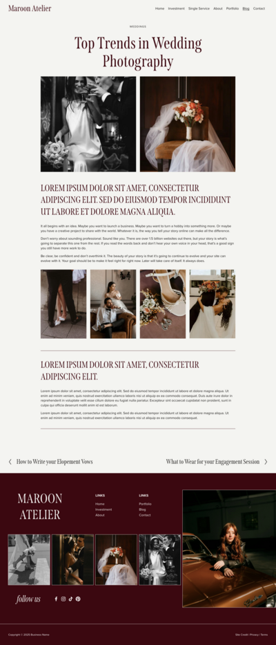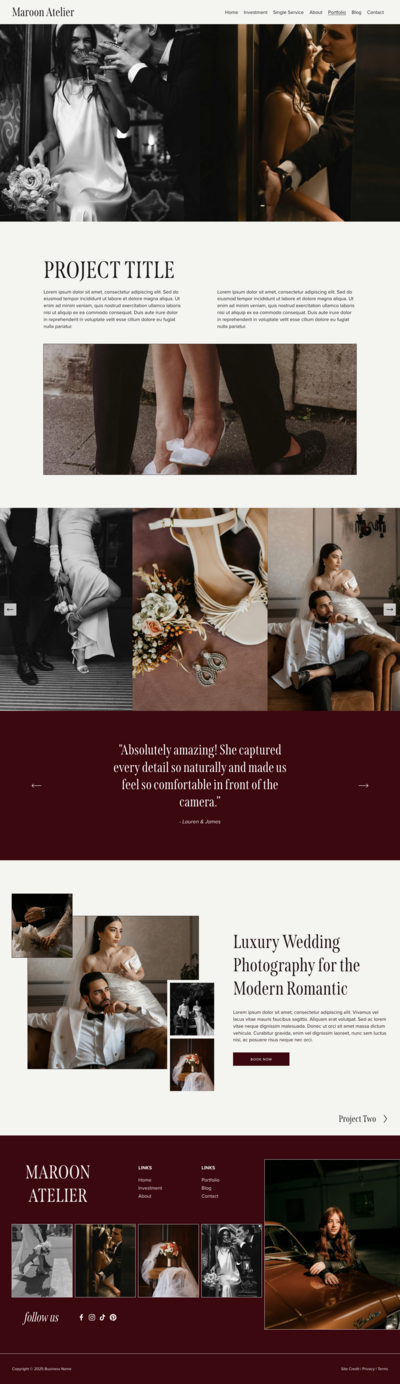 Elevate your brand with this luxury Squarespace website template, perfect for photographers, creatives, and event professionals. Featuring a dark, moody maroon aesthetic and modern editorial design, it’s fully customizable to showcase your portfolio, attract clients, and create a sophisticated, timeless online presence.