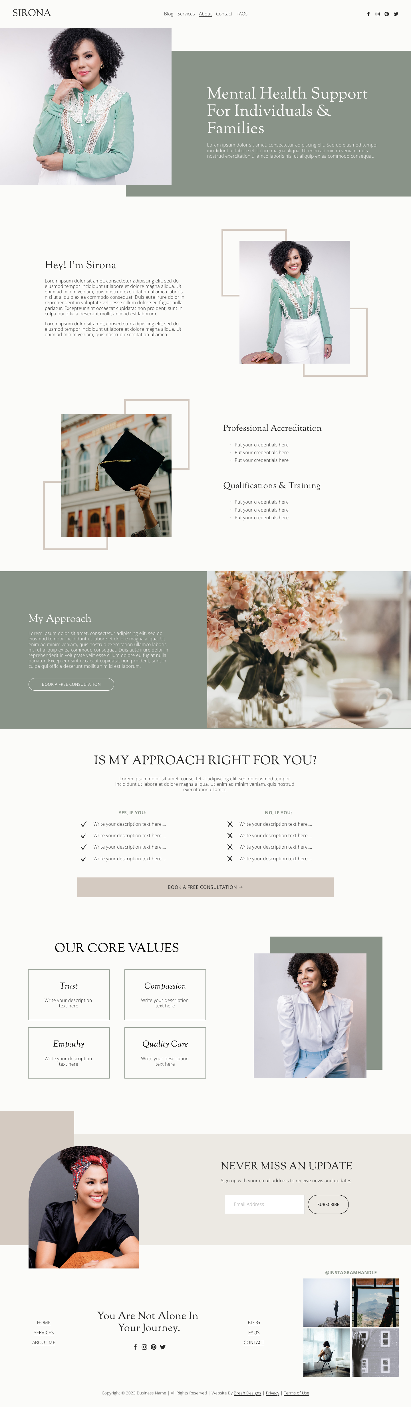 Crafted for therapists, coaches, and wellness professionals, this stylish Squarespace 7.1 template offers a clean, calming design that reflects the heart of your practice. Perfect for both new businesses and rebrands, it’s fully customizable, mobile-friendly, and effortlessly simple to launch - giving you a polished online presence without the tech stress.